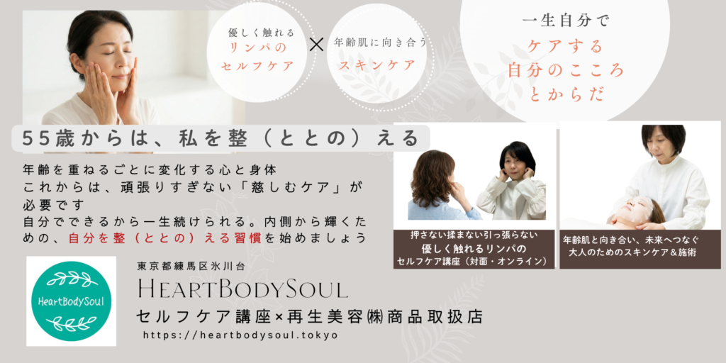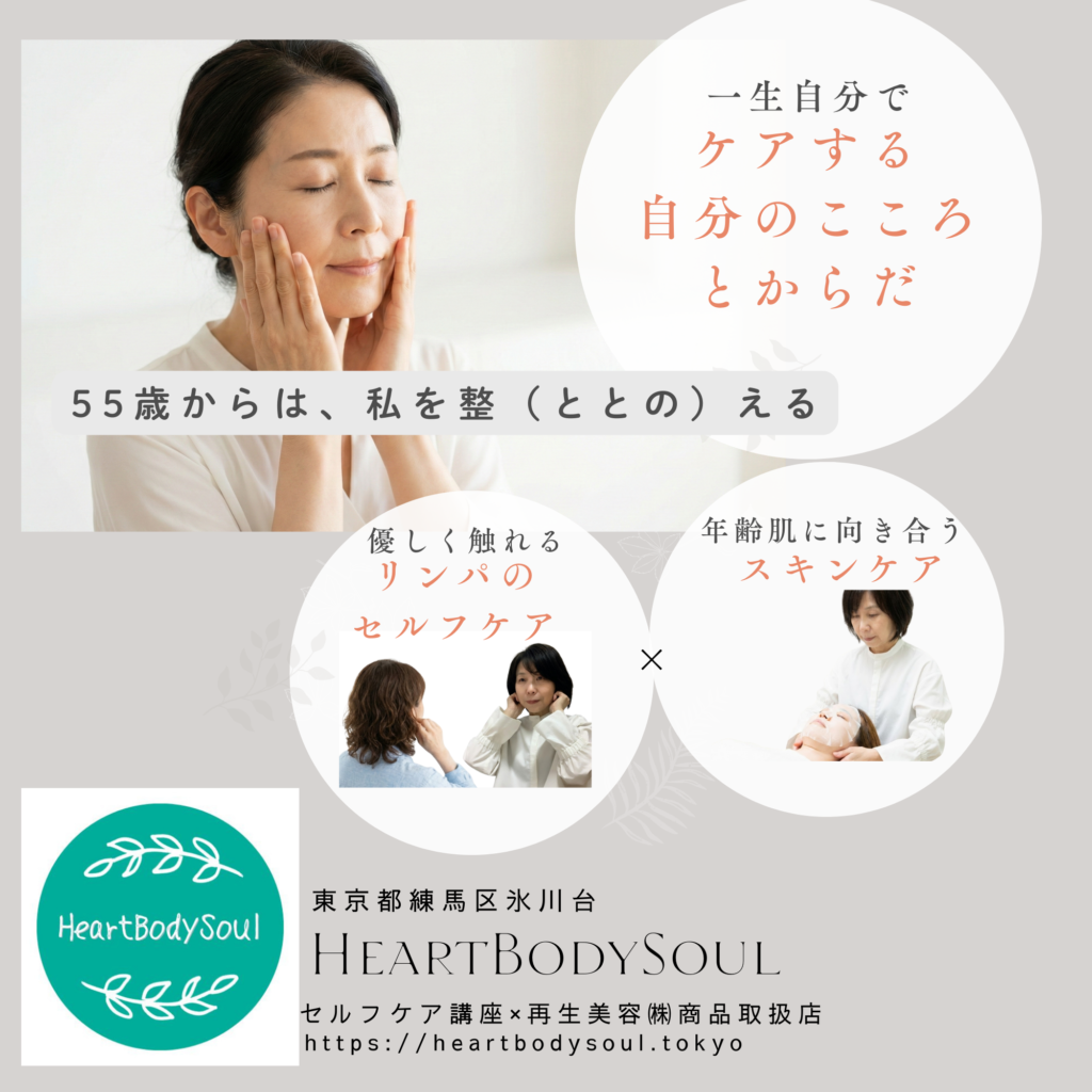 Home お問い合わせ 「ずっと通い続ける」を、卒業してほしいから。HeartBodySoulが本当に目指しているのは、 お客様がサロンを必要としなくなるくらい、ご自身で元気で綺麗になれることです。 不調が出るたびに誰かを頼るのではなく、自分の手で自分を癒せるように。 そんな「一生ものの安心」を手渡したくて、「じぶんセラピスト講座」を開いています。 何歳でも、何歳になってもできる、変わる。いつまでも一番たいせつな自分自身をセルフケアできる。 こころとからだ 健やかに若々しく ご自身のケアのためおとなの美習慣やさしく触れるリンパのセルフケアレッスンCLICK HERE!!↓ じぶんセラピスト講座 詳細はこちらをクリック! セルフケア講座開講のためのさとう式リンパケア セルフケアマスター養成講座CLICK Here!!↓ さとう式リンパケア・セルフケアマスター養成講座 詳細はこちらをクリック! 頑張りすぎない「慈しむケア」で、 55歳からの心と体をリセットする 若い頃とは何かが違うと感じる、今日この頃。こんなサイン、出ていませんか? 疲れがなかなか抜けない夜、ぐっすり眠れない気づくと奥歯を食いしばっている慢性的な肩こり・首こり・頭痛見た目や体力の変化に戸惑っているそれは、年齢を重ねて変化した心と身体からの「助けて」のサインかもしれません。 「強く押す・揉む」は、もう卒業です。凝り固まった体をほぐすために、強い力でグイグイ押したり揉んだりしていませんか?実はその刺激、年齢を重ねたデリケートな身体には逆効果になることも。強い刺激は身体を緊張させ、かえって硬くしてしまうことがあるのです。HeartBodySoulが提供するのは、身体を壊さず、やさしく緩めるケア。「ファシア(結合組織)」をケア 筋肉ではなく、身体全体を包む膜の癒着をやさしく解きます。やさしく触れるリンパケア 強い圧は不要。老廃物をスムーズに回収し、巡りを整えます。心まで届くリラックス 神経に働きかけるタッチで、張り詰めた緊張を深い部分からオフにします。 年齢肌と向き合うスキンケア高い化粧品を使っても、以前のような手応えがない… そう感じるのは、年齢とともに肌の状態が変化しているからです。 これまでのスキンケアは、減ってしまった成分を上から「補う」ことが中心でした。HeartBodySoulでは、 美容業界でも注目される先端技術を応用した、年齢肌に向き合うスキンケアアイテムを取り入れています。話題の美容成分「間葉系幹細胞培養上清液※」を配合。肌のすみずみ(角質層)まで整え、ハリと潤いに満ちた状態へ導きます。素肌の美しさを呼び覚ますような質感へ表面を取り繕うのではなく、素肌そのものが持つ美しさにアプローチします。※整肌成分として 心・身体・肌。すべては繋がっています。身体の緊張をほどき、先端の美容科学で肌を慈しむ。 そうすることで、心もホッと安心する感覚を取り戻せます。HeartBodySoulは、講座とセッションを通じて、そのすべてをサポートします。これからは「鍛える」のではなく「慈しむ」時間を。 一生続けられる新しい習慣で、健やかで若々しい毎日を始めませんか? こころもからだもホッとできる時間を Heart Body Soul Therapy こころとからだのために ●じぶんセラピスト講座 ●さとう式リンパケア・セルフケアマスター養成講座 ●からだの声を聴く×からだを整える 整体セッション ●再生美容㈱の化粧品アイテム使用・近赤外光BeamOnOneセッション (ご自身のための)Lesson MENUやさしく触れるリンパのセルフケア&Laraup ワークショップ じぶんセラピスト講座一生、私が「私の専属セラピスト」になる 揉まない、押さない、そして頑張らない。顔の強い刺激も、ストレッチも強い指圧も、もう必要ありません。これまでの常識を覆すのは、優しく触れて呼吸するこれまでと「逆」のアプローチ。年齢とともに固まった心と身体が、ふわっと緩んでいく。不調も美容も、自分の手で慈しみながら整える。何歳になってもできる何歳になっても変化する一生モノのセルフケアを始めませんか?***********●体験講座(60分)●3Days(120分×3回・美容や筋緊張を緩めるポイントをマスターしたい方に)●5Days(更年期以降の身体の変化を感じる方、全身より深くケアを身に着けたい方におすすめ) ハルさま痛みが減っていくのは嬉しいですが、 それ以上に、 辛い状態を自分でケアできることの全能感とでも言える感覚を持ち始めていることに興奮しています。 身体と心は繋がってて、 自分を心から信頼する、ということが本当に腹落ちしたのは、 このセルフケア講座のおかげです。 ありがとうございました。 これからも自分を愛おしみながら生きていきたいと思います read more (講師養成のための)Lesson MENUさとう式リンパケア セルフケアマスター養成講座 【セルフケアマスター養成講座の概要】 ・さとう式の理論 ・セルフケアマスター講座テキスト掲載の手技 ・講座終了後課題あり。テキスト、デュプロマあり。 ・セルフケアマスターになると、さとう