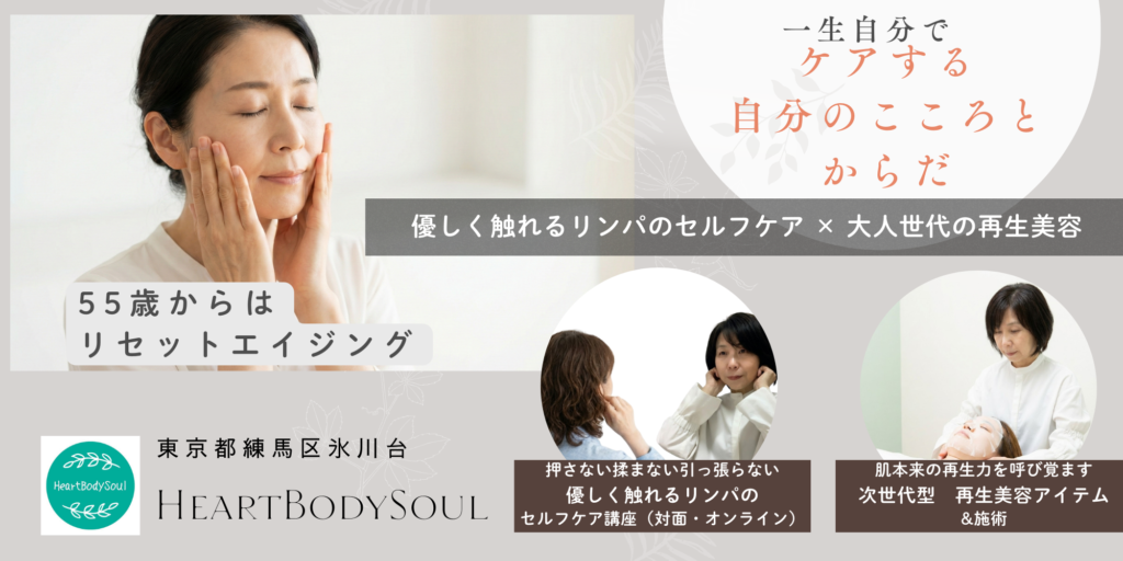 Home お問い合わせ 「ずっと通い続ける」を、卒業してほしいから。HeartBodySoulが本当に目指しているのは、 お客様がサロンを必要としなくなるくらい、ご自身で元気で綺麗になれることです。 不調が出るたびに誰かを頼るのではなく、自分の手で自分を癒せるように。 そんな「一生ものの安心」を手渡したくて、「じぶんセラピスト講座」を開いています。 何歳でも、何歳になってもできる、変わる。いつまでも一番たいせつな自分自身をセルフケアできる。 こころとからだ 健やかに若々しく ご自身のケアのためのやさしく触れるリンパのセルフケアレッスンCLICK HERE!!↓ じぶんセラピスト講座 詳細はこちらをクリック! セルフケア講座開講のためのさとう式リンパケア セルフケアマスター養成講座CLICK Here!!↓ さとう式リンパケア・セルフケアマスター養成講座 詳細はこちらをクリック! 頑張りすぎない「慈しむケア」で、 55歳からの心と体をリセットする 若い頃とは何かが違うと感じる、今日この頃。こんなサイン、出ていませんか? 疲れがなかなか抜けない夜、ぐっすり眠れない気づくと奥歯を食いしばっている慢性的な肩こり・首こり・頭痛見た目や体力の変化に戸惑っているそれは、年齢を重ねて変化した心と身体からの「助けて」のサインかもしれません。 「強く押す・揉む」は、もう卒業です。凝り固まった体をほぐすために、強い力でグイグイ押したり揉んだりしていませんか?実はその刺激、年齢を重ねたデリケートな身体には逆効果になることも。 強い刺激は身体を緊張させ、かえって硬くしてしまうことがあるのです。 HeartBodySoulが提供するのは、身体を壊さず、やさしく緩めるケア。 「ファシア(結合組織)」をケア 筋肉ではなく、身体全体を包む膜の癒着をやさしく解きます。やさしく触れるリンパケア 強い圧は不要。老廃物をスムーズに回収し、巡りを整えます。心まで届くリラックス 神経に働きかけるタッチで、張り詰めた緊張を深い部分からオフにします。 肌も、「補うだけ」の時代から「呼び覚ます」時代へ。「高い化粧品を使っても、以前のような手応えがない…」 そう感じるのは、肌の基礎力が変化しているからです。これまでのスキンケアは、減ってしまった成分を上から「補う」ことが中心でした。しかし、大人の肌に必要なのは、肌本来の力を底上げすること。 HeartBodySoulでは、再生医療の分野でも注目される技術を応用した、次世代の再生美容アプローチを取り入れています。 先進の美容成分「間葉系幹細胞培養上清液※」を配合肌のコンディションを根本(角質層)から整え、ハリと潤いに満ちた状態へ導きます。 内側から輝くような質感へ表面を取り繕うのではなく、素肌そのものが持つ「美しくなろうとする力」にアプローチします。※整肌成分として 心・身体・肌。すべては繋がっています。身体の緊張をほどき、先端の美容科学で肌を慈しむ。 そうすることで、心もホッと安心する感覚を取り戻せます。HeartBodySoulは、講座とセッションを通じて、そのすべてをサポートします。これからは「鍛える」のではなく「慈しむ」時間を。 一生続けられる新しい習慣で、健やかで若々しい毎日を始めませんか? こころもからだもホッとできる時間を Heart Body Soul Therapy こころとからだのために●じぶんセラピスト講座 ●さとう式リンパケア・セルフケアマスター養成講座 ●からだの声を聴く×からだを整える整体セッション ●再生美容化粧品アイテム使用・近赤外光BeamOnOneセッション Lesson MENUやさしく触れるリンパのセルフケア&Laraup ワークショップ じぶんセラピスト講座一生、私が「私の専属セラピスト」になる 揉まない、押さない、そして頑張らない。顔の強い刺激も、ストレッチも強い指圧も、もう必要ありません。これまでの常識を覆すのは、優しく触れて呼吸するこれまでと「逆」のアプローチ。年齢とともに固まった心と身体が、ふわっと緩んでいく。不調も美容も、自分の手で慈しみながら整える。何歳になってもできる何歳になっても変化する一生モノのセルフケアを始めませんか? *********** ●体験講座(60分) ●3Days(120分×3回・美容や筋緊張を緩めるポイントをマスターしたい方に) ●5Days(更年期以降の身体の変化を感じる方、全身より深くケアを身に着けたい方におすすめ) ハルさま痛みが減っていくのは嬉しいですが、 それ以上に、 辛い状態を自分でケアできることの全能感とでも言える感覚を持ち始めていることに興奮しています。 身体と心は繋がってて、 自分を心から信頼する、ということが本当に腹落ちしたのは、 このセルフケア講座のおかげです。 ありがとうございました。 これからも自分を愛おしみながら生きていきたいと思います read more Lesson MENUさとう式リンパケア セルフケアマスター養成講座 【セルフケアマスター養成講座の概要】 ・さとう式の理論 ・セルフケアマスター講座テキスト掲載の手技 ・講座終了後課題あり。テキスト、デュプロマ
