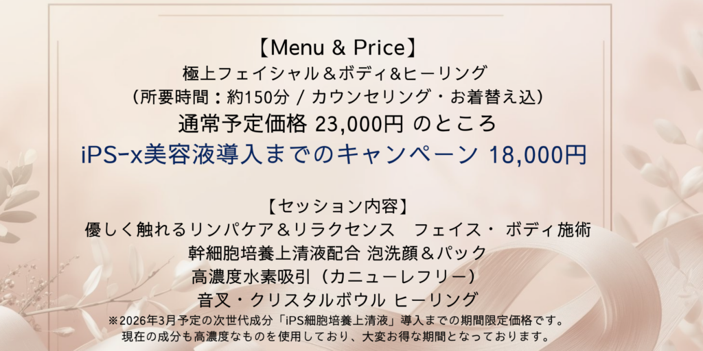美容・健康・リラックスTotal Tuning Session 毎日のことだからセルフケアが一番大事だけど、たまには全身リラックスして勝手に綺麗に楽になりたいそんな時はTotal Tuning Sessionでお待ちしています ●押したり揉んだり引っ張ったりのボディセラピーが苦手な方。●普段セルフケアでファシアをふわっとさせるケアをしているのに、普通のフェイシャルエステの刺激でも強すぎると感じている。●さとう式リンパケアやリラクセンスボディセラピーの、身体に負担をかけずに、身体のパフォーマンスを上げる施術を受けてみたい。●水素吸引、幹細胞培養上清の美容液などの医療からヒントを得たアイテムを試してみたい。●クリスタルボウルや音叉などで全身の力がぬけるリラックス・ヒーリングタイムを持ちたい。 それ全部セッションに入れました!!! 身体の芯から緊張が抜けていくホッと安心感を感じるようなそんなセラピーはいかがですか?人間はストレスを感じると無意識に奥歯を噛み締めます。顎を緩めることで固くなった顔の筋肉も柔らかく表情にも変化を感じていただけると思います。セッションは顔、頭の先から足の先まで全身を対象に行います。 さとう式リンパケアさとう式リンパケアでは、顎や顔にアプローチすることから口腔を広くし、さらに胸腔・腹腔を広げることで全身の循環をよくしていきます。一般的な押す揉む引っ張るようなアプローチではなく、触れる揺らすなどのアプローチで、身体が本来のパフォーマンスを取り戻せるように生体理論に基づいてリンパケアです。また、筋肉を緩めることで筋肉本来の柔軟性とボリュームを蘇らせることで身体を楽に、可動域を広げていきます。施術の中にはじぶんセラピスト講座で扱うセルフケアもいくつか入っていますが、施術で体感していただくと、その触れ方の軽さに驚かれる方がほとんどです。 Youtube リラクセンスボディセラピー、さとう式リンパケア 共に押したり揉んだりしないセッションです。セッションの内容はその方の状況に合わせて、お客様とご相談しながら行わせていただきます。 リラクセンスボディセラピーリラクセンスとは、「Relax=リラックス」と「Sense=感覚」を合わせた造語です。忙しい日常生活や仕事、人間関係などのストレスから凝り固まってしまった体をゆるめ、リラックスした感覚(リラクセンス)を再び(Re)取り戻していくための方法がリラクセンスボディセラピー。リラクセンスボディセラピーは強い力でこちらが相手を変えるのではなく、相手の体の声を聴きながら、相手の体が動きたい方向に寄り添っていきますので、自分で自分の体の声に気づき、不要な緊張を自分のペースで手放すことができます。 Youtube クリスタルボウルとは?クリスタルボウルは水晶でできたボウル上の倍音の音を奏でる楽器です。水晶は太古の昔から地球にある鉱石。そして水晶の主成分のケイ素(シリカ)は人間の骨や爪髪の毛などにも含まれため、水晶の音の振動に私達の身体が共鳴すると言われています。身体を緩める整体を受けたあとは、マッサージベッドに横になったまま数分間、クリスタルボウルの音の共鳴を身体で感じるリラックスタイムをお過ごしください。 年齢と向き合う、未来志向のスキンケアセッションの中では、さとう式リンパケアのお顔に対する施術とともに、再生医療の分野で注目されている「間葉系幹細胞培養上清液」、浸透型NMN誘導体をとりいれたメディカル発想のスキンケアアイテムを使用します。55歳からの年齢肌に向き合うスキンケアは「与える」だけではなく、「整える」「取り除く」そして「育てる」ケアが大事だと考えています。水素吸引もしながらゆっくりエステ施術もお受けください再生美容㈱から2026年3月にいよiPS培養上清液 美容液【ips-x】が発売されます。発売に伴いセッションに取り入れていく予定です。また当サロンでも販売致しますので、ご期待ください。 【Sessionの流れ】 1. リラックス&リリースベッドに横になっていただき、フェイス周りの施術からスタート。日常の緊張や表情のこわばりを丁寧に緩めていきます。2. 濃密泡の洗顔&パッククレンジング後、間葉系幹細胞培養上清や浸透型NMN誘導体を配合したアイテムを使用します。スキンケアソープでお顔を包み込みます。クリアになったお肌をフェイスマスクで整え、選び抜かれた美容成分を角質層のすみずみまで届けます。3. ストレスフリーな水素吸引 × ボディケアマスクタイム中は、高濃度の水素でインナーケアを。カニューレ(鼻チューブ)を使用しないため、自然な呼吸でリラックスしたまま取り入れていただけます。ボディへの施術も同時に行い、全身の巡りを整える至福の時間です。4. 音による深いヒーリングお仕上げの後は、そのままリラックスタイムへ。音叉とクリスタルボウルの美しい波動が、緩んだ身体と心に染み渡ります。ただ音に身を委ねる、贅沢な余韻をお楽しみください。 Total Tuning Sessionご感想 林 幸代様(